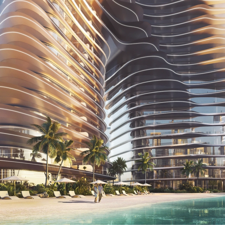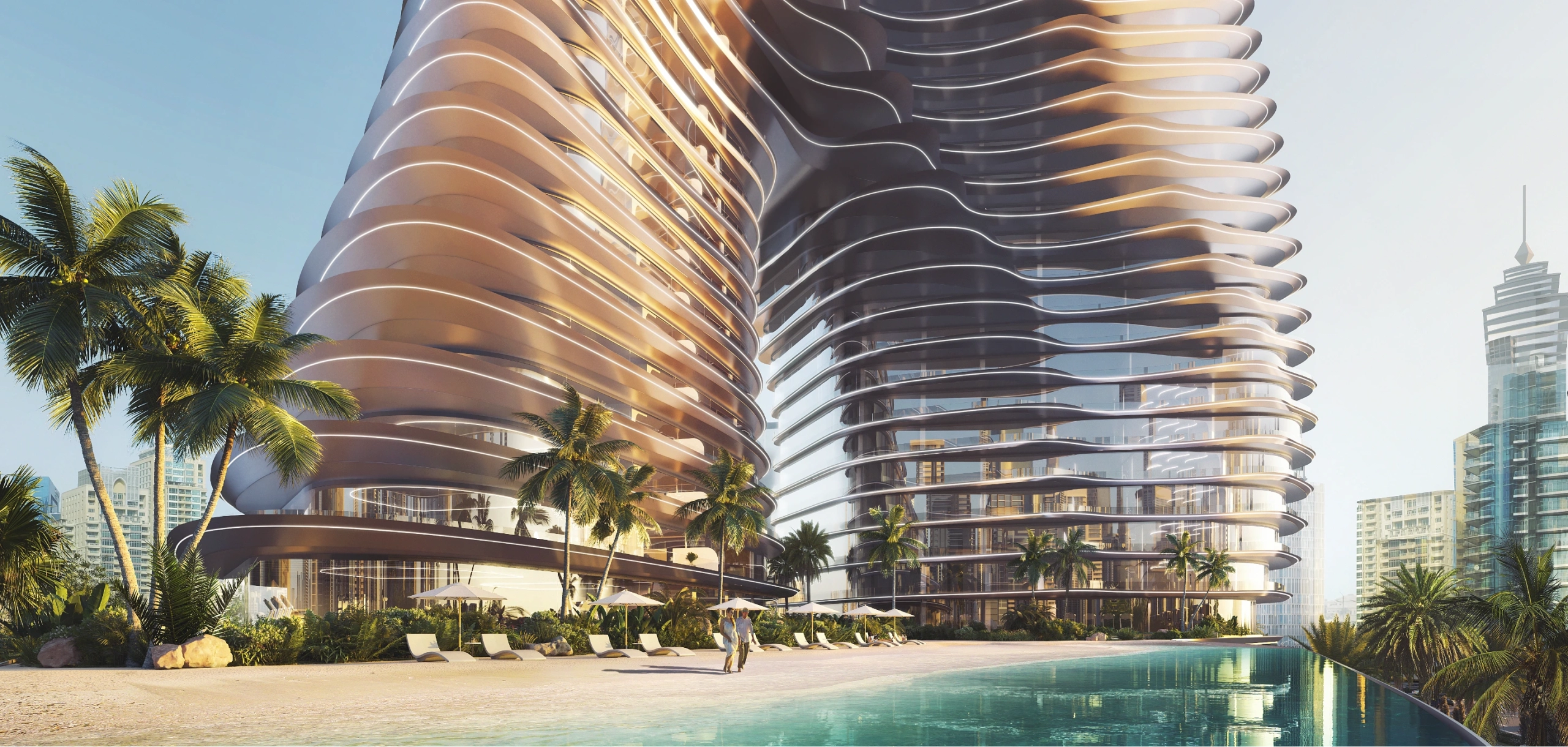 The architecture is boldly inspired by the French Riviera — fluid curves, sculptural façade, resort-style living in the heart of the city. It offers ultra-luxury apartments and penthouses, with lavish amenities such as a Riviera-inspired private beach, VIP lounges, private garages and car-lifts for upper-level residences.